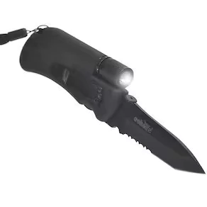 - Corpo em ABS - Material: Lâmina em aço 440 inoxidável - Mini lanterna em Led - Possui pedra para produzir faisca e fogo - Cordão de nylon - Apito de emergência - Clip passador - Trava de segurança manual